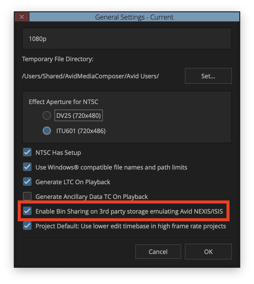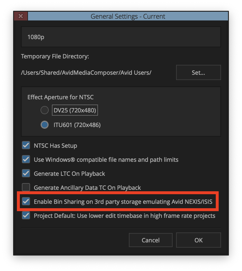3. Ensure that the box next to Enable Bin Sharing on 3rd party storage emulating Avid NEXIS/ISIS is enabled.