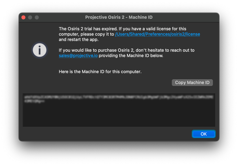 /Users/Shared/Preferences/osiris2/license. Repeat this step for each licensed system. Each license file has the name of the Computer it belongs to in its filename. - Proceed with the usage chapter.