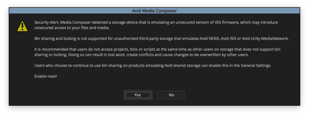 12. Avid will no prompt you with the following message. This is Avid’s way of saying that third-party bin locking is enabled. Answer the question with Yes.
