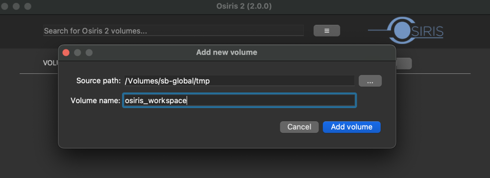 4. In the Volume name field, provide a name for your new Osiris volume (Please avoid spaces in volume names but use underscores instead)