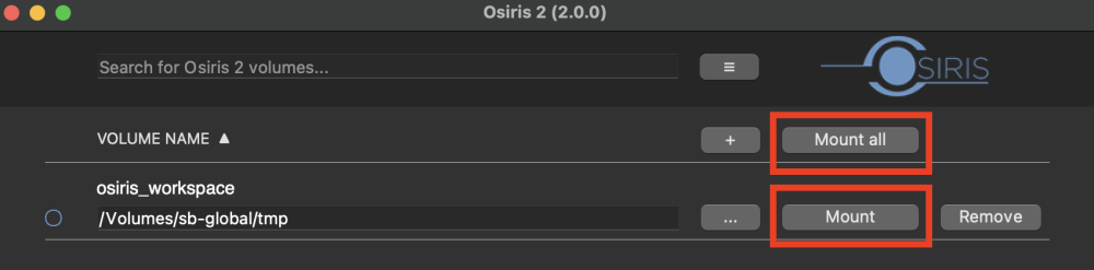 7. Mount a volume by clicking on the “Mount” button next to its name or click on the “Mount all” button to mount all of your Osiris volumes. You can mount up to 20 Osiris volumes simultaneously.