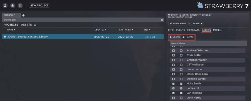 4. Check the Write box next to the user or team you want to give write access to the selected project. Check the View box if the user should see the project in the Strawberry PAM UI but should not be allowed to open it.