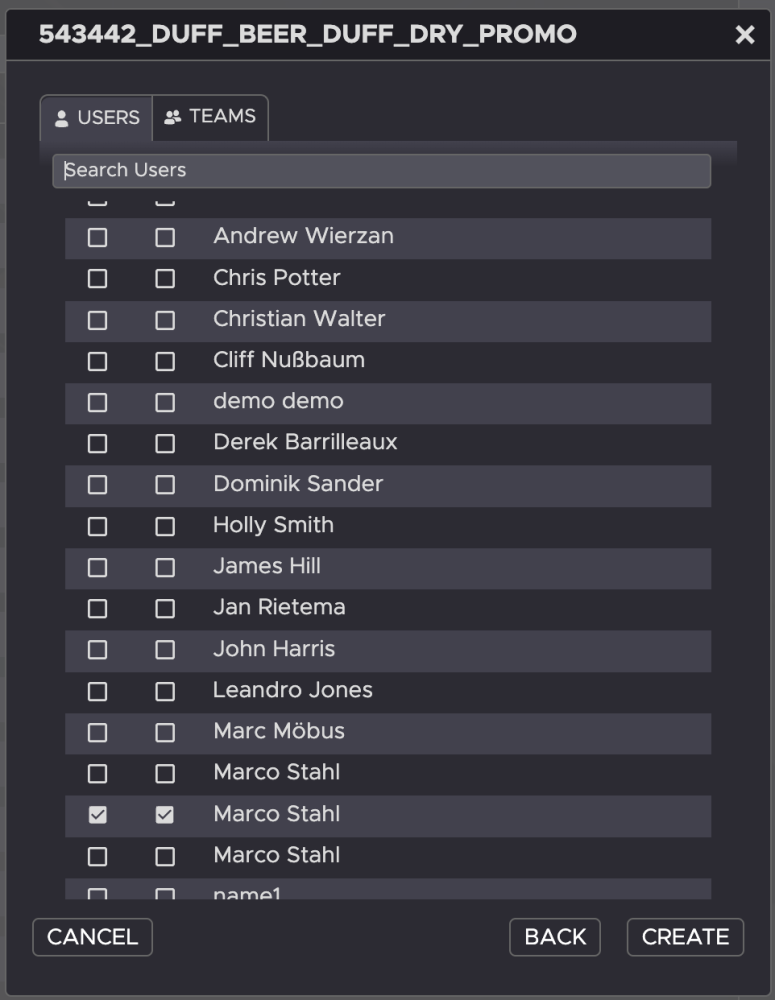 5. Assign the project to individual users or to teams by using the Users and Teams tabs. Users with “read & viewing” access will be able to open and modify the project on their workstations. Users with “view” will be able to see and browse the project in the Strawberry user interface, but will not be able to open it for modification. Then click “Create”.