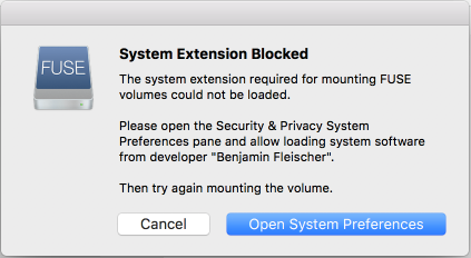 Benjamin Fleischer FUSE for macOS kernel extension must be installed and allowed as a dependency on macOS. Users with strongly secured environments receive a warning to allow 3rd-party driver installation.