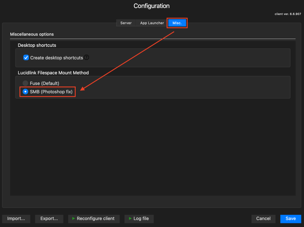 4. In the client configuration, click on the Misc tab and then select the radio button next to SMB (Photoshop fix.