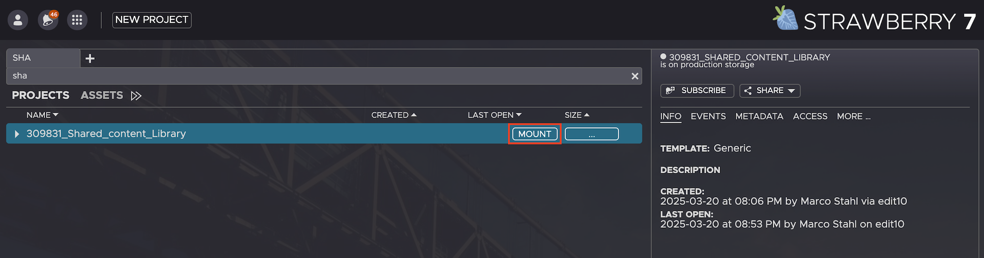 3. Once the project has been mounted, it will automatically be mounted on the editing workstation. Depending on the Strawberry server configuration, the project will either appear inside a designated drive letter (Windows) or in a volume named Mounted Projects (macOS). On macOS, a Mounted Projects entry will be visible in the favourites menu in Finder.