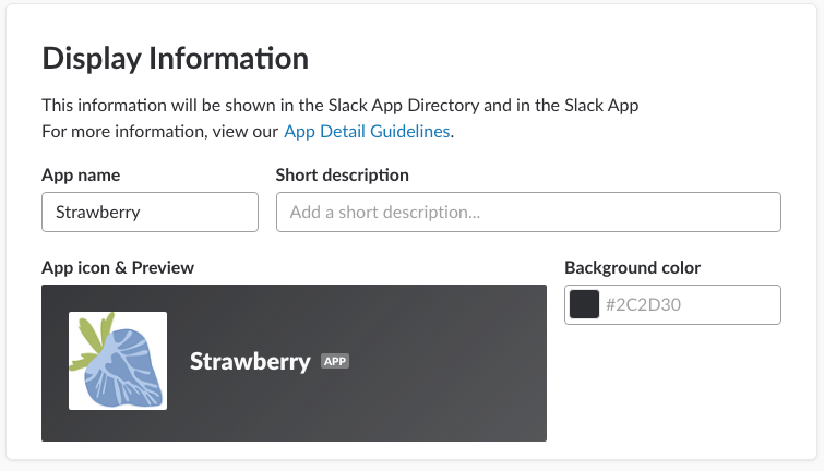 6. On the basic information, page scroll down to “Display Information” and customize your app as needed. You must set a Background color for your app as this is required by Slack!