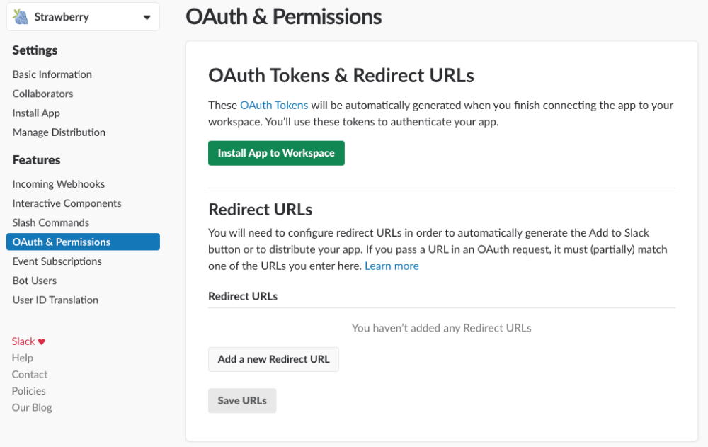 13. On the “OAuth & Permissions” page, click on the “Install App to Workspace” button