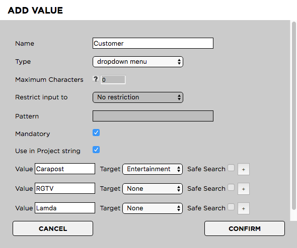 - Use in Project String: Defines if items from this dropdown will appear in the project name if the users enable the checkbox “Create Project Name from Metadata” upon project creation.