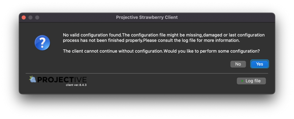 1. When you start the Strawberry client for the very first time, you will be greeted with a “No valid Configuration found.” message.