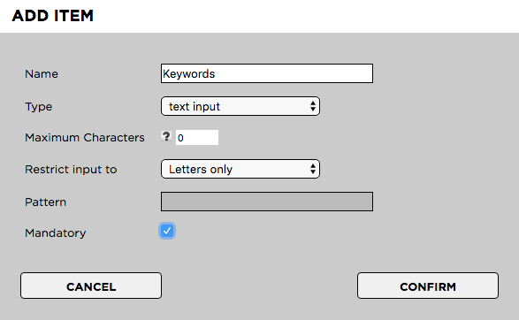 - Name: The name of the text input field as the users will see it (for example: “Keywords”)