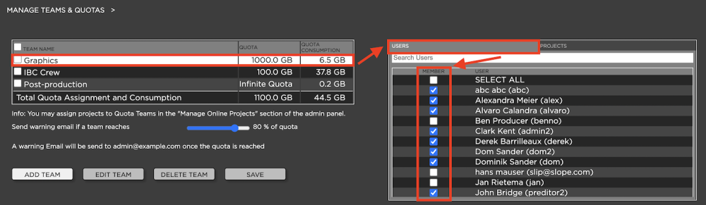 Manage Teams & Quotasbar. - Click on the team name to which you want to assign users.