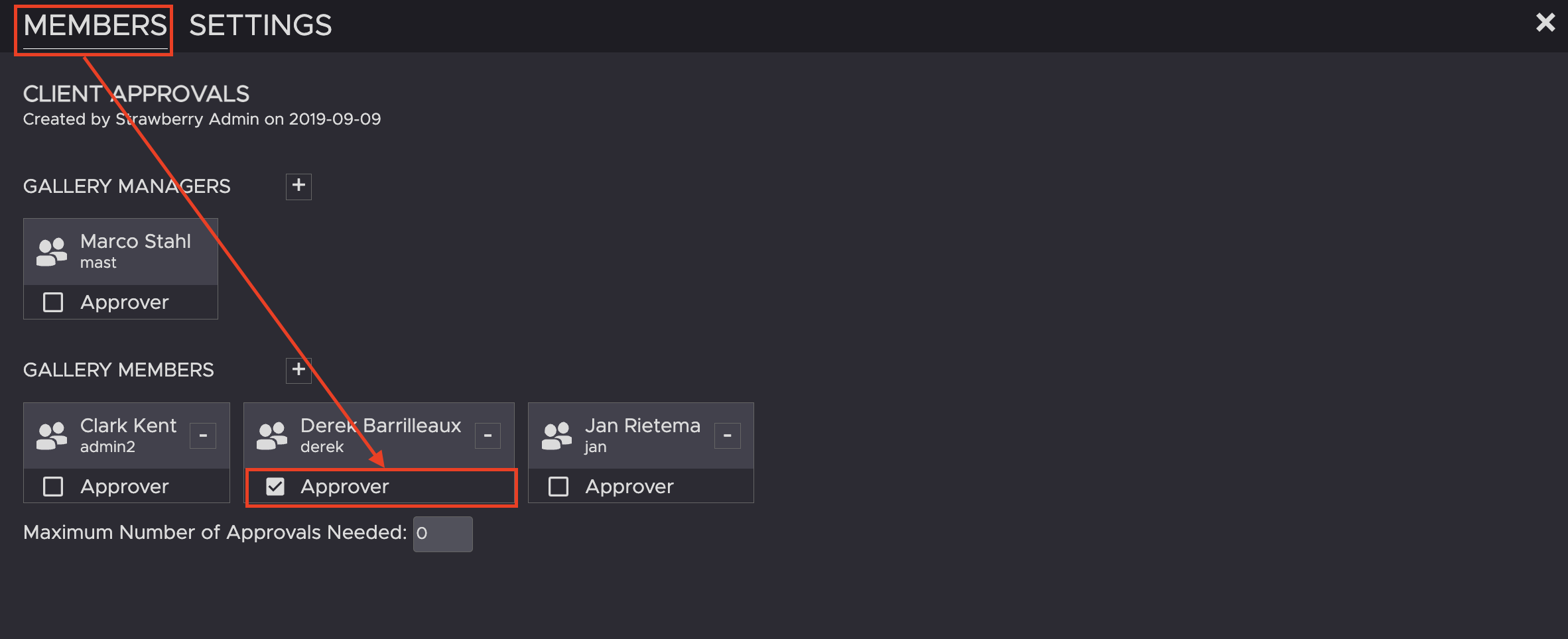 3. In the MEMBERS tab, check the box below the name of the person you want to become an approver.
