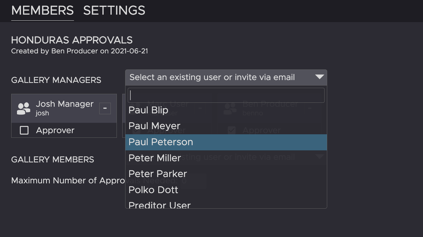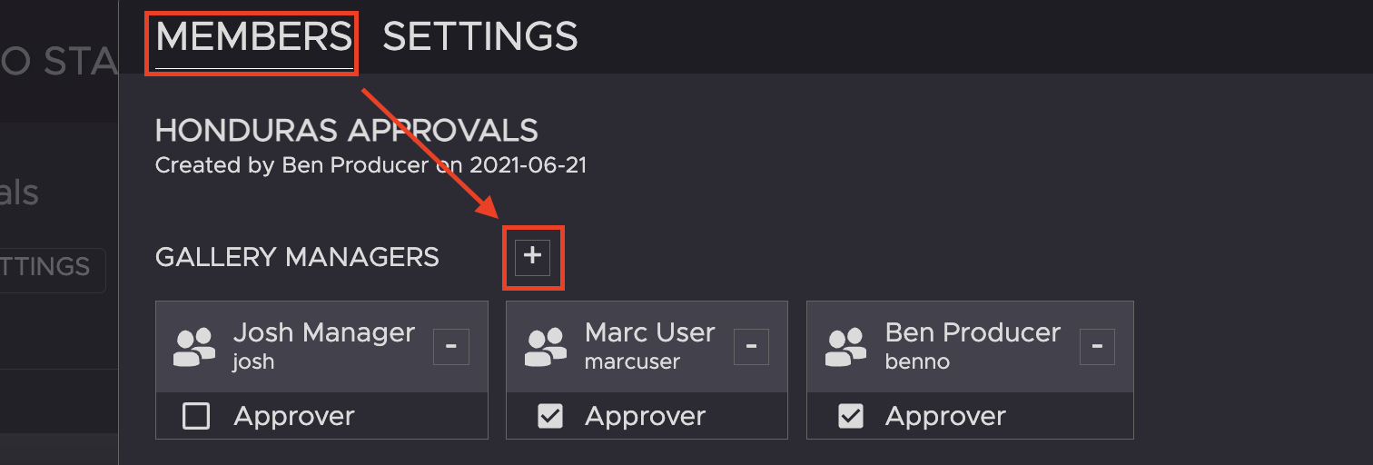 3. In the MEMBERS tab, click on the + button next to “Gallery Managers”.