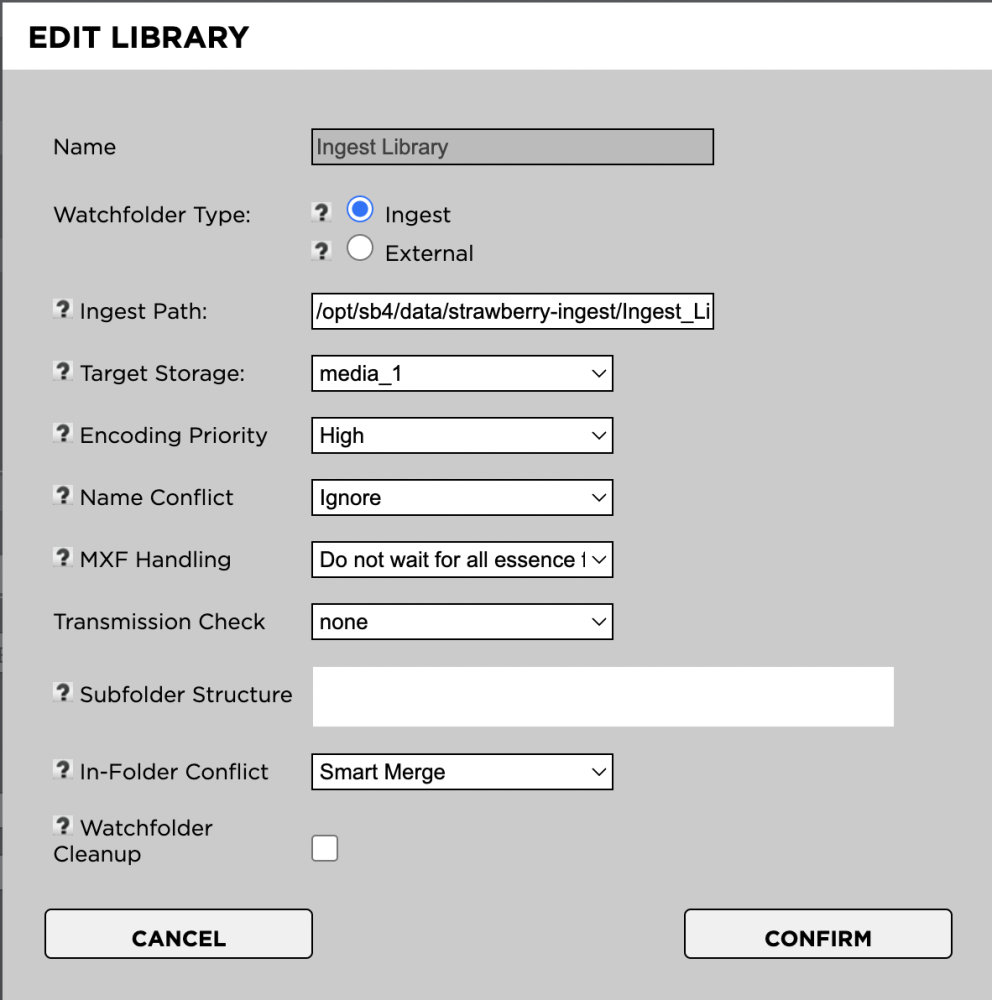 Before configuring an ingest library you’ll need to create an ingest watch folder. Ingest watch folders can be created inside the “strawberry-ingest” folder on your shared storage. If you wish to use a different watch folder location, please contact us.