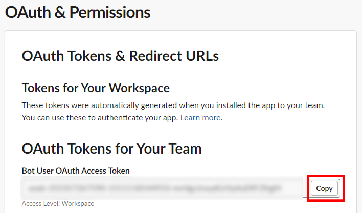 17. Once back on the OAuth & Permissions page, click on the Copy button below Bot User OAuth Access Token.