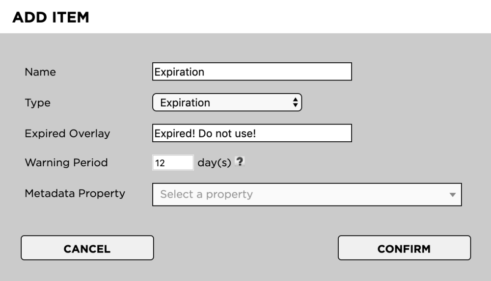 This is the name label of the expiration field as users will see it in the user interface. The overlay will be shown permanently on the video. Example: