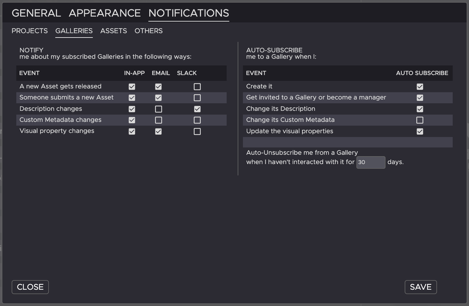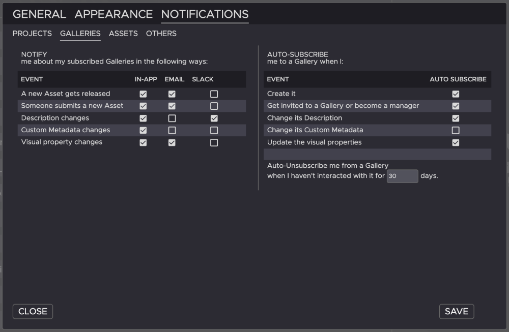 Here, you can define what kind of Gallery notifications you want to receive and how they should be delivered to you.