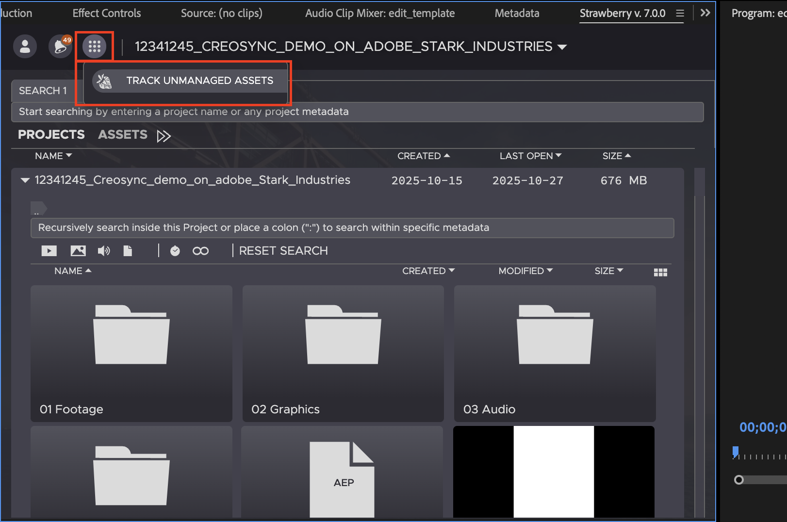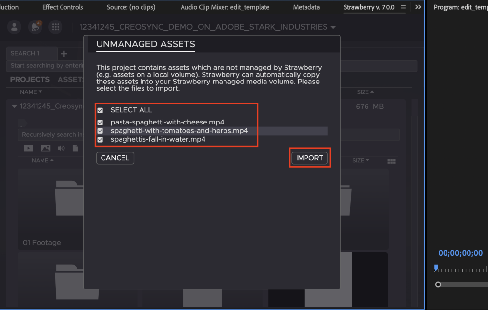 Strawberry’s panel extension for Premiere Pro CC allows you to bulk-import “unmanaged media assets” into your current project. A media asset is considered unmanaged when it is present as a master clip in your open Premiere project but not located in the Strawberry project on the shared storage.