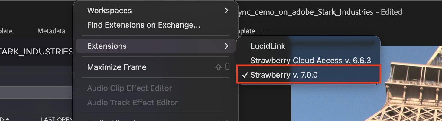 - Once the project is open in Premiere or After Effects, go to “Window / Extensions” and click on the Strawberry extension