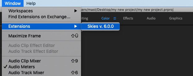 3. In Premiere, navigate to “Window → Extensions” and click on the “Skies” entry. The version number shown in the screenshot below might be different from the version number shown on your screen