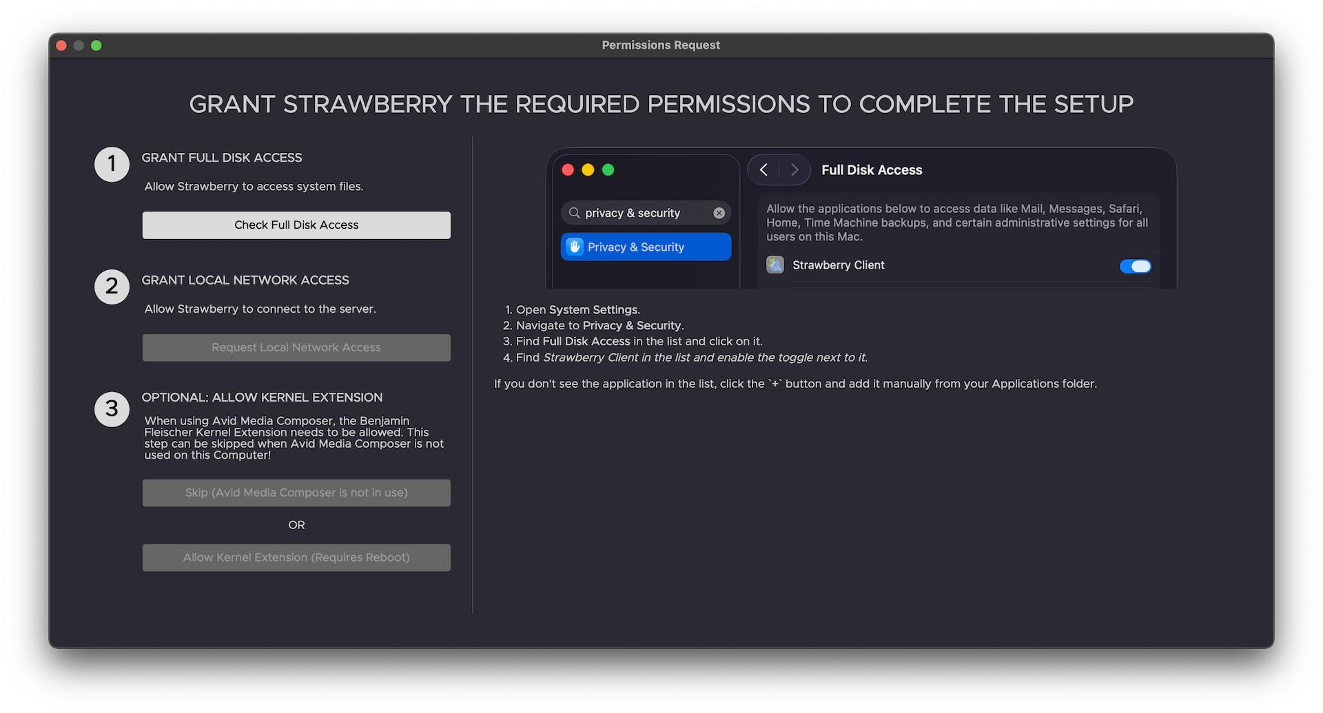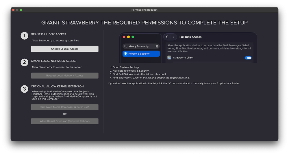 6. On first launch, the permission screen will appear. On this screen, you must grant the Strawberry client Full Disk Access and local network access. Follow the instructions in the permission screen to complete steps 1 and 2. Only perform step 3 (Allow Kernel Extensions) if your computer is running Avid Media Composer, and you plan to use it with Strawberry. If that’s not the case, you want to skip this step by clicking on the Skip (Avid Media Composer is not in use) button.