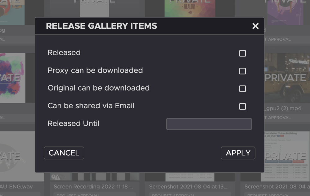 Defines how long the asset stays released (visible to Gallery members) until becoming “private” again.