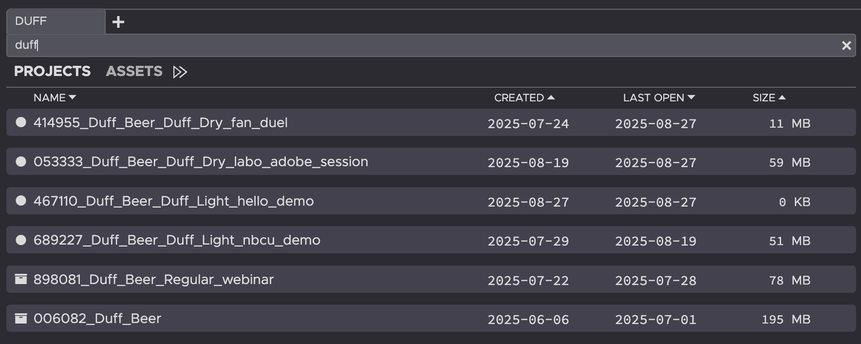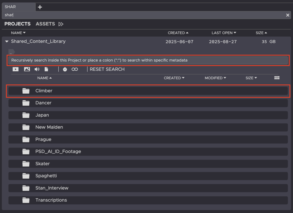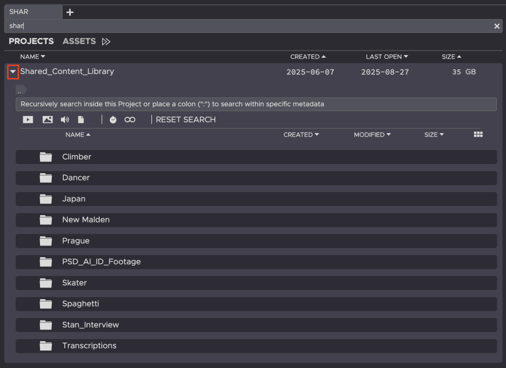 5. Use the search field to search for media assets inside this particular project or click on the folder icon to enter the project’s folder structure.