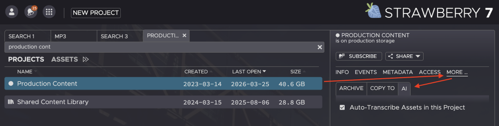 4. Important! Auto-transcribe will not transcribe existing assets; it only transcribes new ones. If you want to transcribe existing assets in this project on an ad hoc basis, right-click on the project and click on AI Transcribe.